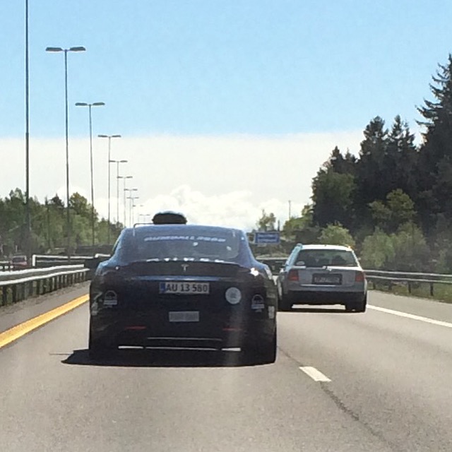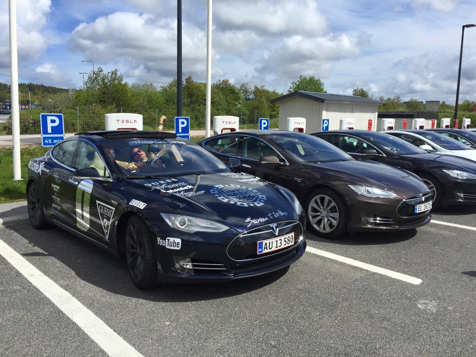 Reisen gikk videre på E6 mot Kjøbenhavn, sa da var det fristende å legge seg på hjul. Det var moro å kjøre E6 sørover og se alt folkelivet på broer og langs veien. De deltagende bensinbilene stoppet ulike steder underveis og var dermed uforutsigbare og derfor ikke så lette å se nærmere på. For Teslafans var det ganske enkelt å gjette seg til hvor de to Teslaene ville stoppe….