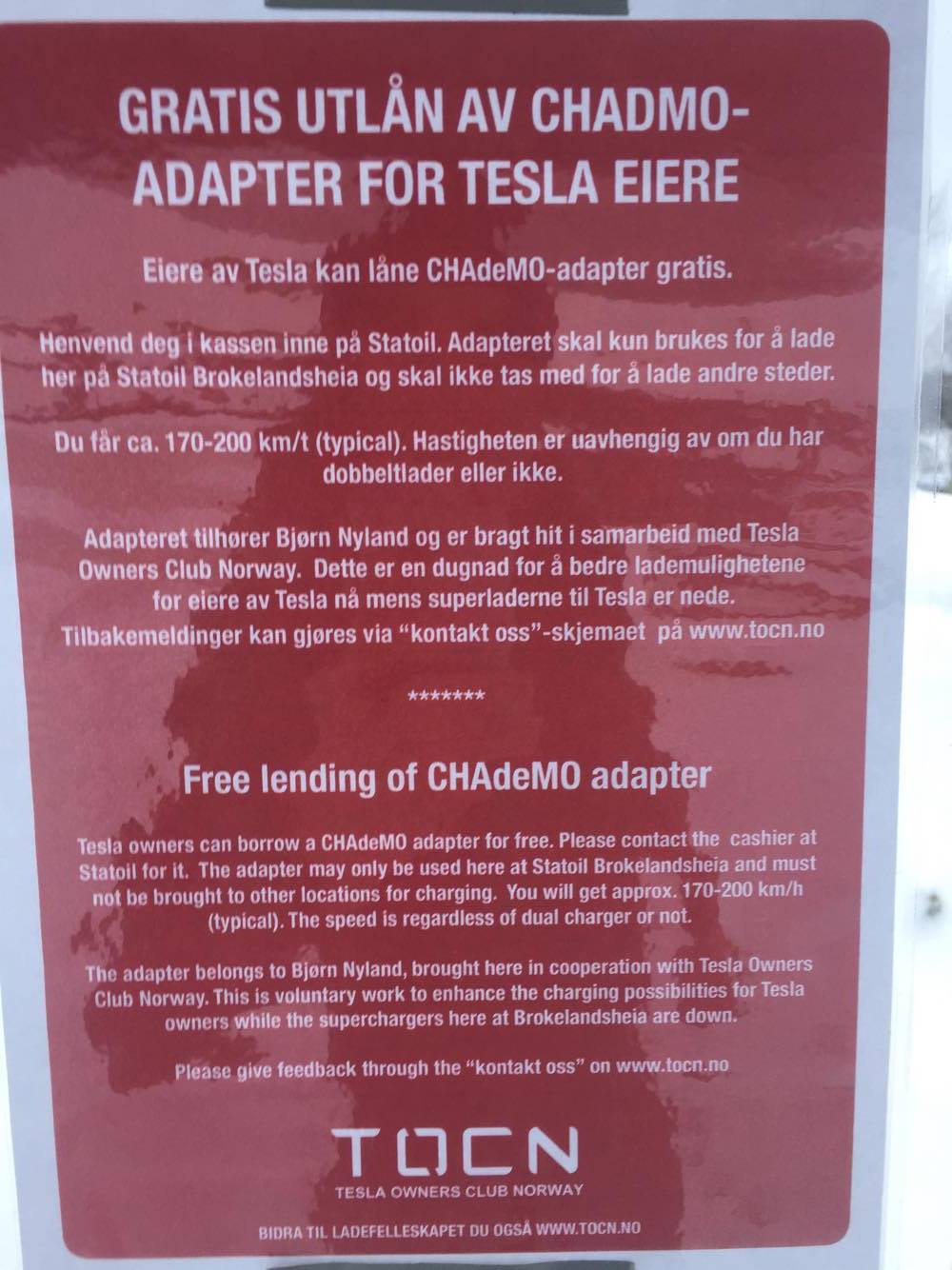 TOCN fikk nylig organisert det slik at det ligger et tilgjengelig Chademo-adapter på Statoil på Brokelandsheia til bruk på Grønn Kontakt sin lader. Denne ble kjørt hit fra Kristiansand av en Teslaeier, og er et av låneadapterene som vanligvis er til utleie der.