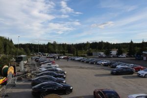 Det store oppsamlingspunktet sørfra var på Kløfta. For oss som kom fra Fornebu, var det et imponerende syn å se alle bilene som allerede ventet på oss der. Vi var garantert flere enn de 54 påmeldte, – men det gjorde jo ikke noe!