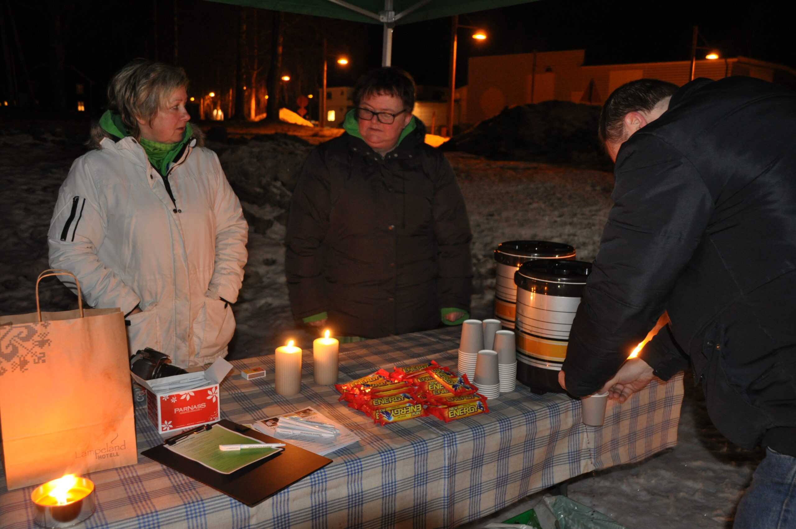 Kiwi/Circle-K serverte varm drikke og “new energy” sjokolade før vi alle gikk opp til Lampeland Kro for å kjøpe oss middag.