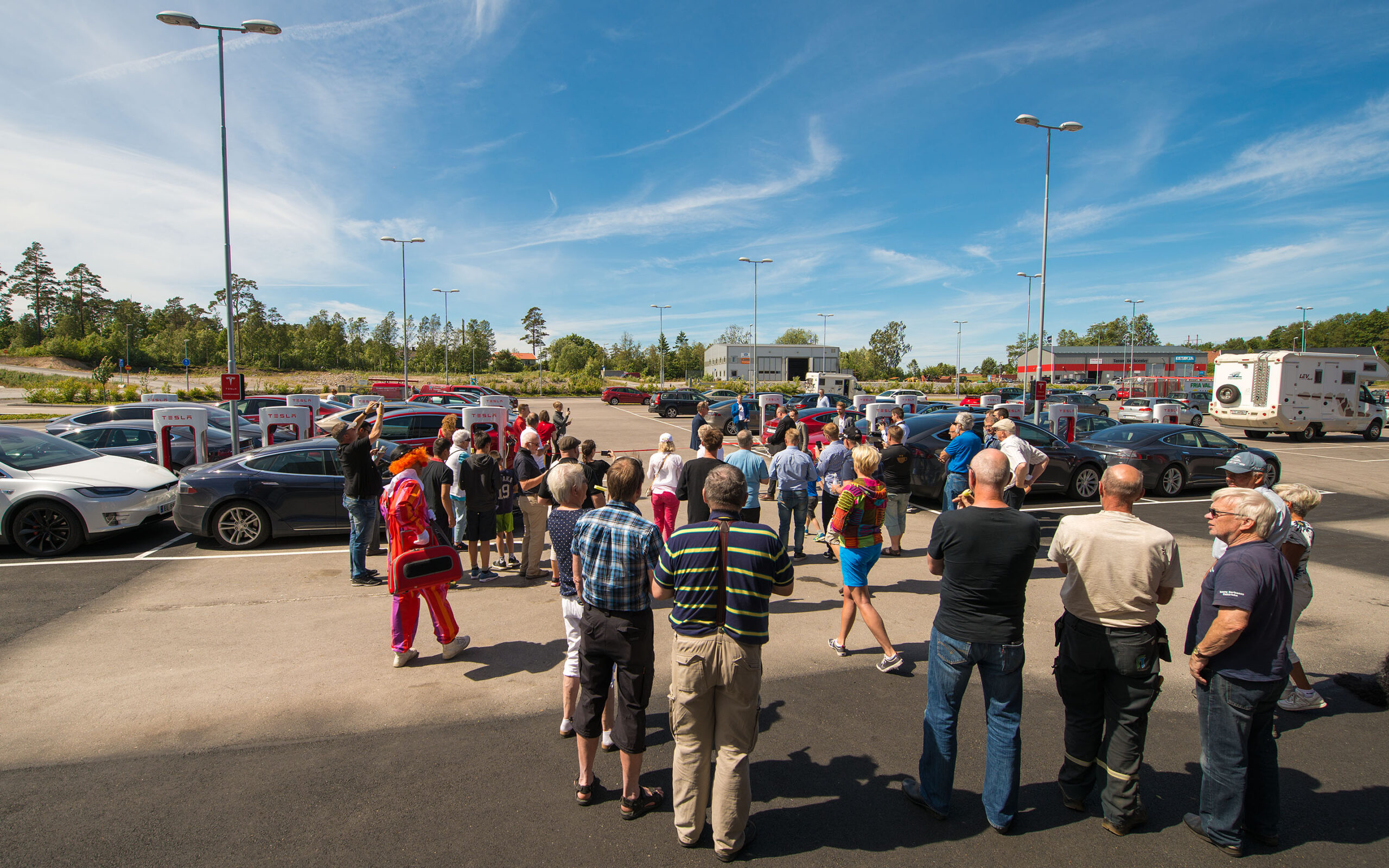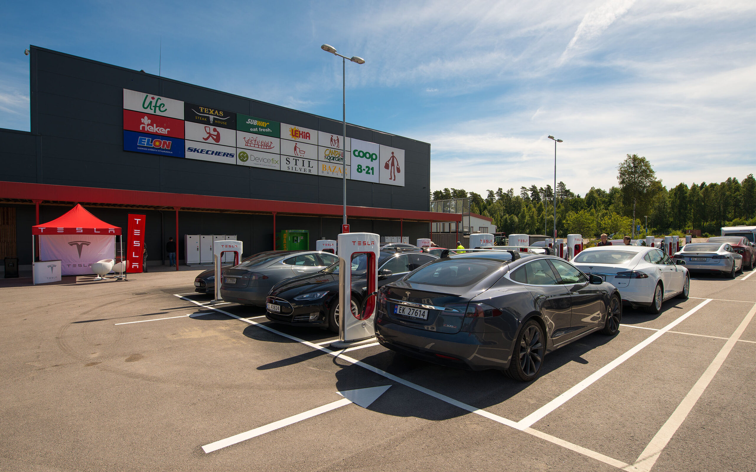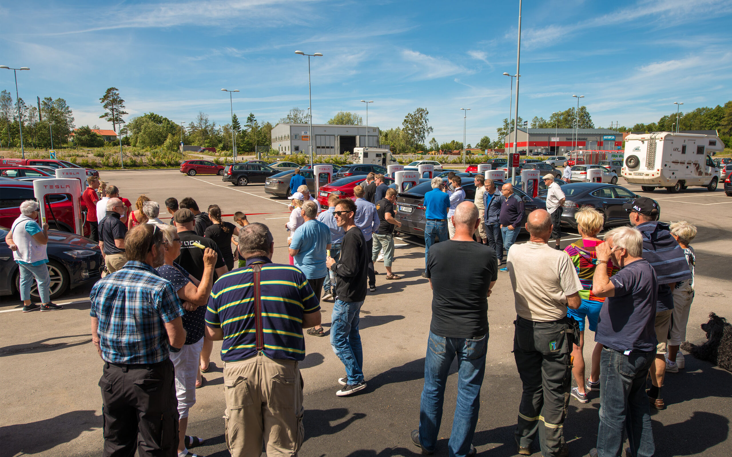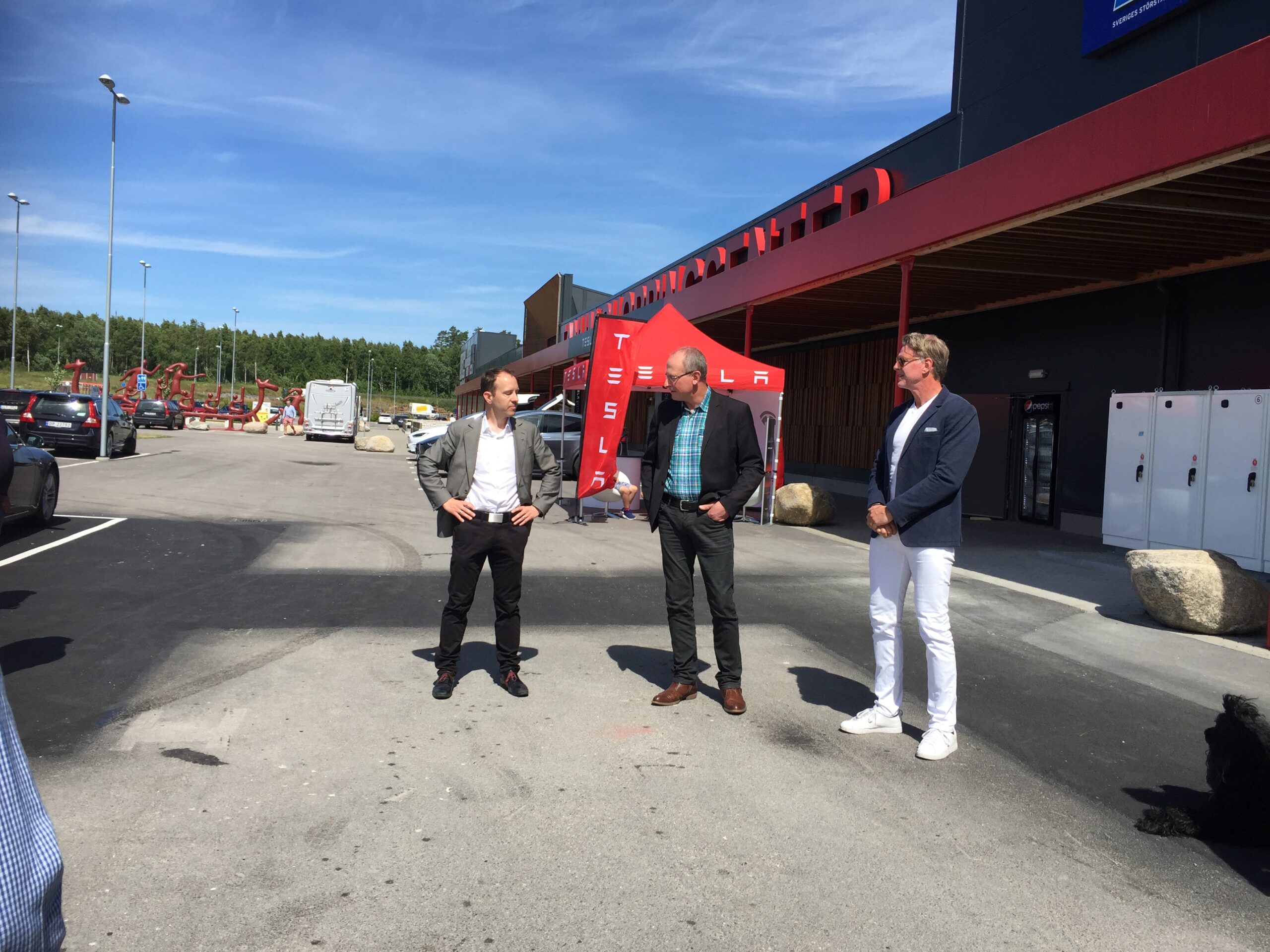 Sju teslaer suste sammen fra Norge på en solrik fredag siste dagen i juni. Sveriges aller største Supercharger skulle åpnes med høytidelighet.