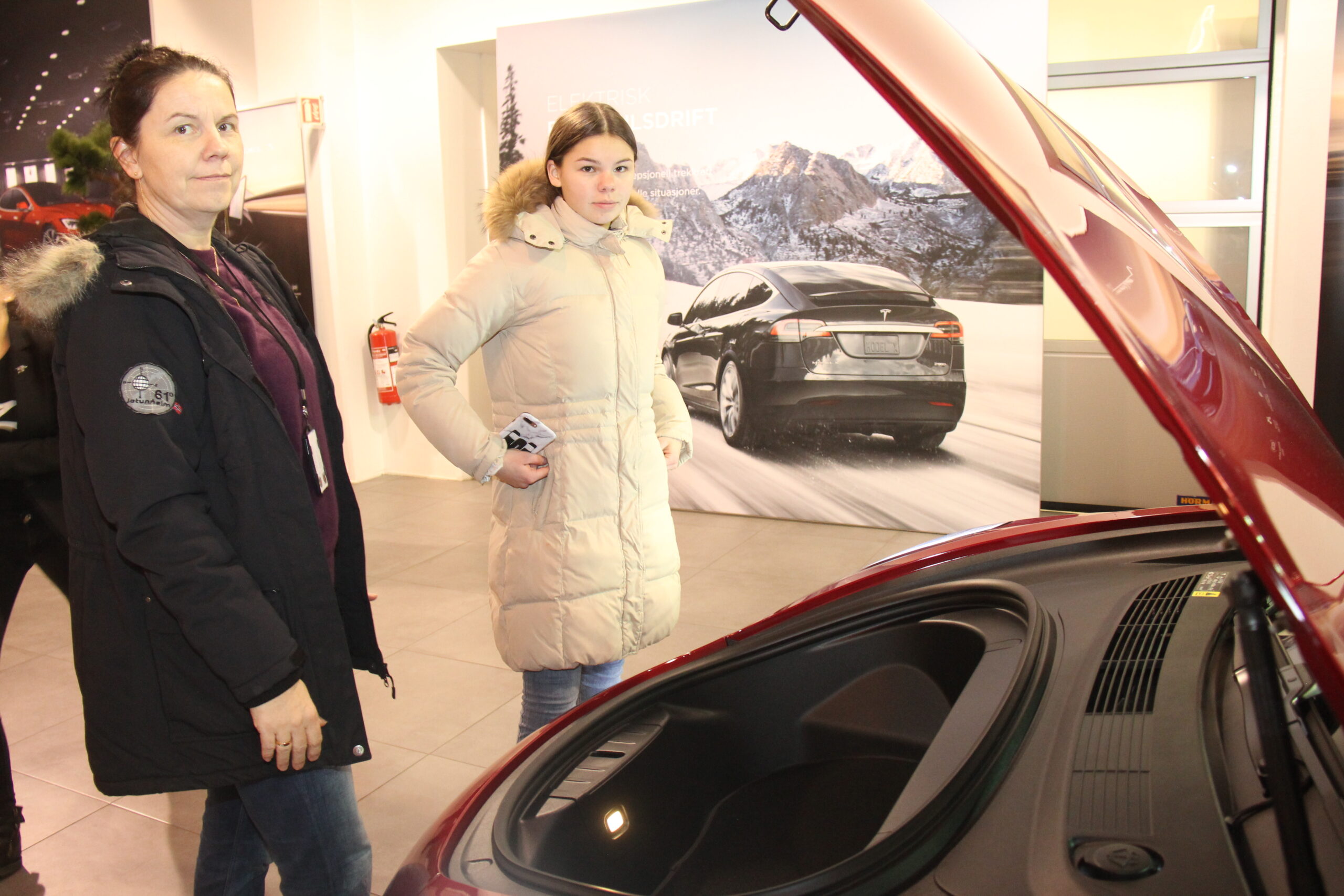 – Denne bilen var utrolig fin, og jeg likte at den har så mye teknologi at en nesten må ha undervisning for å komme seg inn og ut av bilen, utbrøt Michelle Åstrøm fra Nannestad. Hun hadde tatt med stedatteren Helena Slåen (16) for å se på denne bilen som ble bestilt for to og et halvt år siden. I mellomtiden har de kjørt rundt i en Leaf, men nå sto gleden nesten i taket over å se at bestillingsbilen snart blir virkelighet.