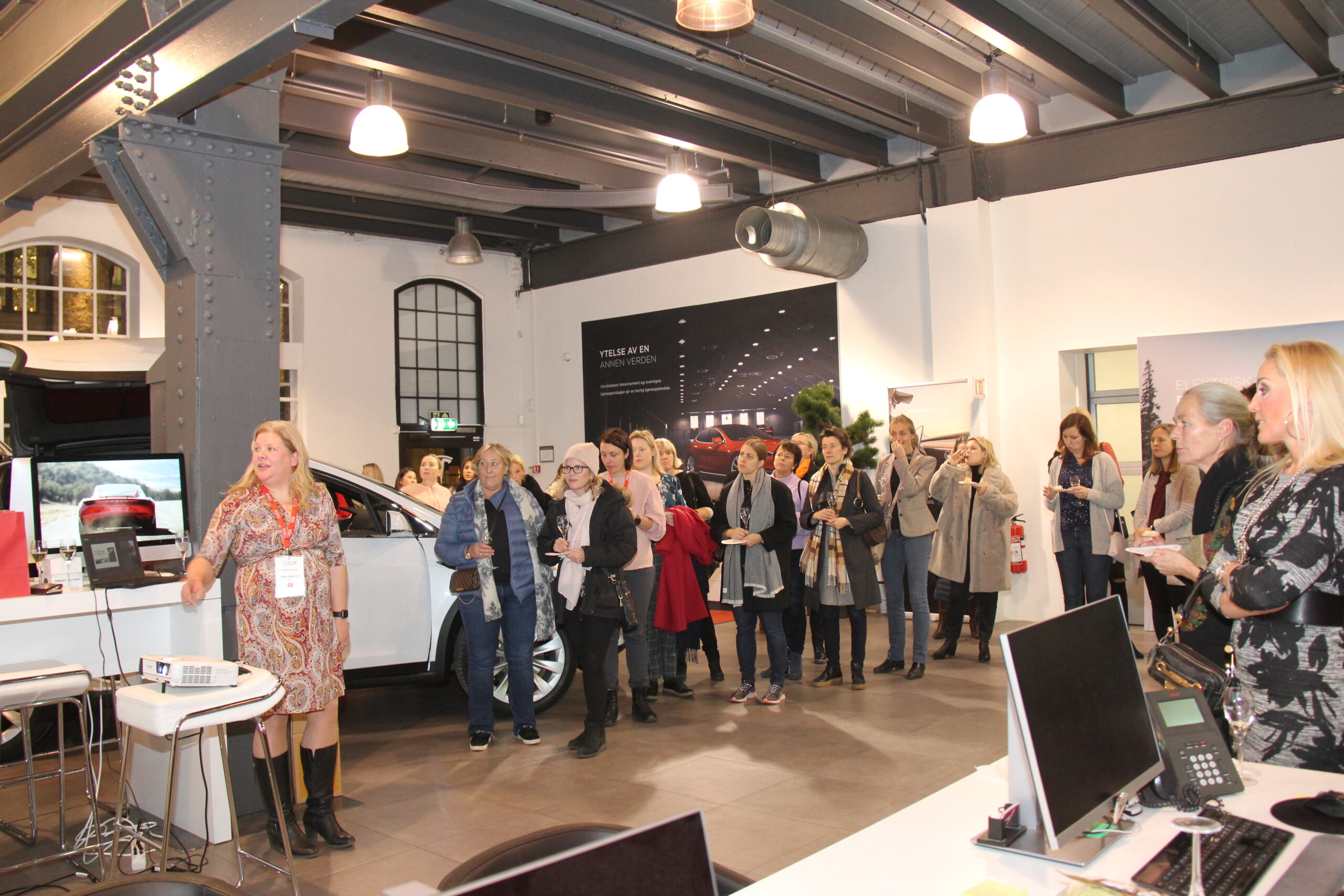 Programmet for kvelden var egentlig ganske enkelt: mingling, informasjon om Model 3, og om Tesla i vintermodus. Vigdis Haugland Asbjørnsen fortalte også fra sitt første møte med Model 3 i USA tidligere i høst og viste fram mange flotte bilder på storskjerm og til sist skulle det tas et fellesbilde av damene.