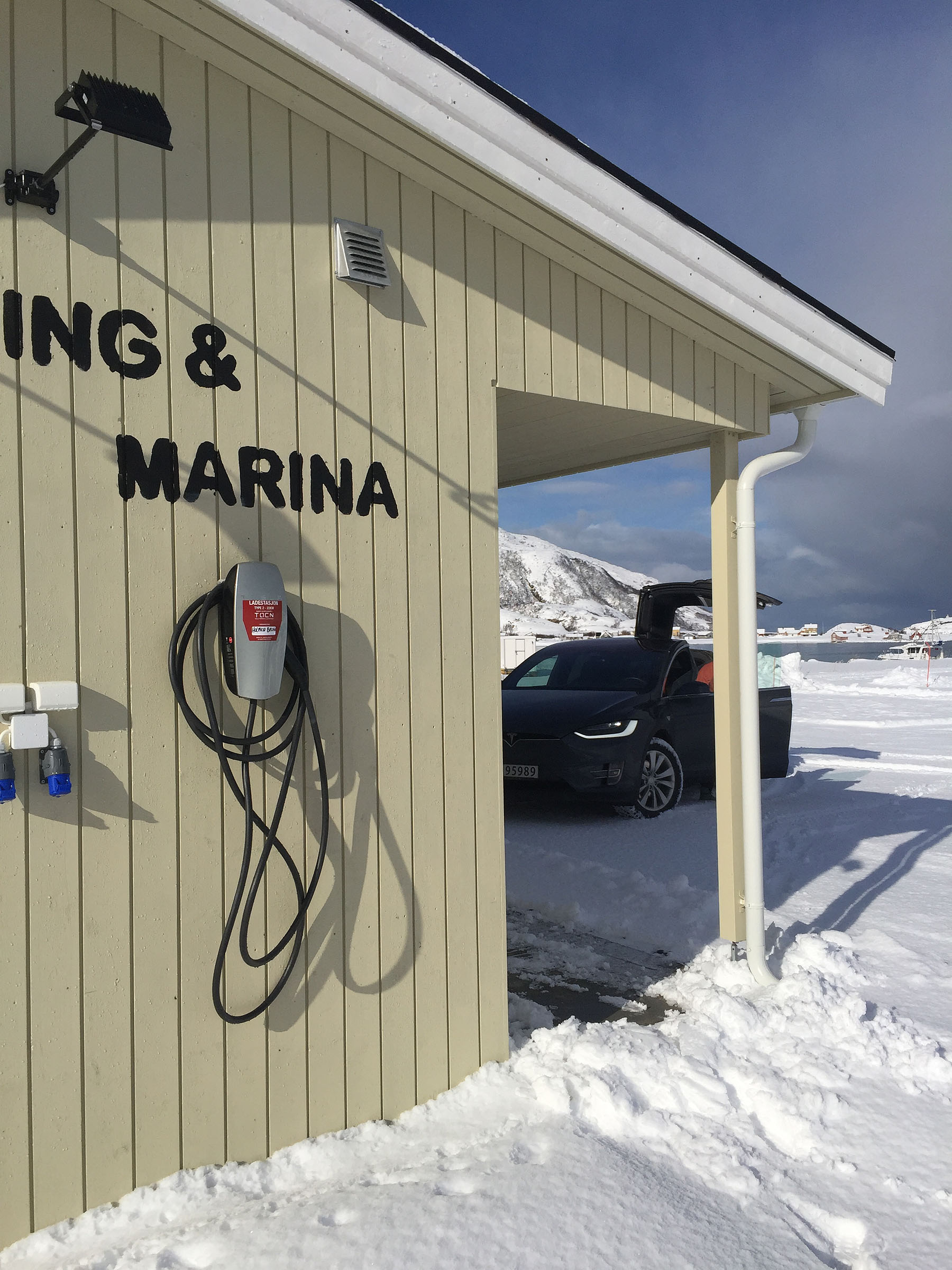 Ett ladepunkt (Tesla Wall Connector, 230V-25A 3-fas) henger på veggen på servicehuset til campingplassen, https://www.facebook.com/sommaroycamping/.