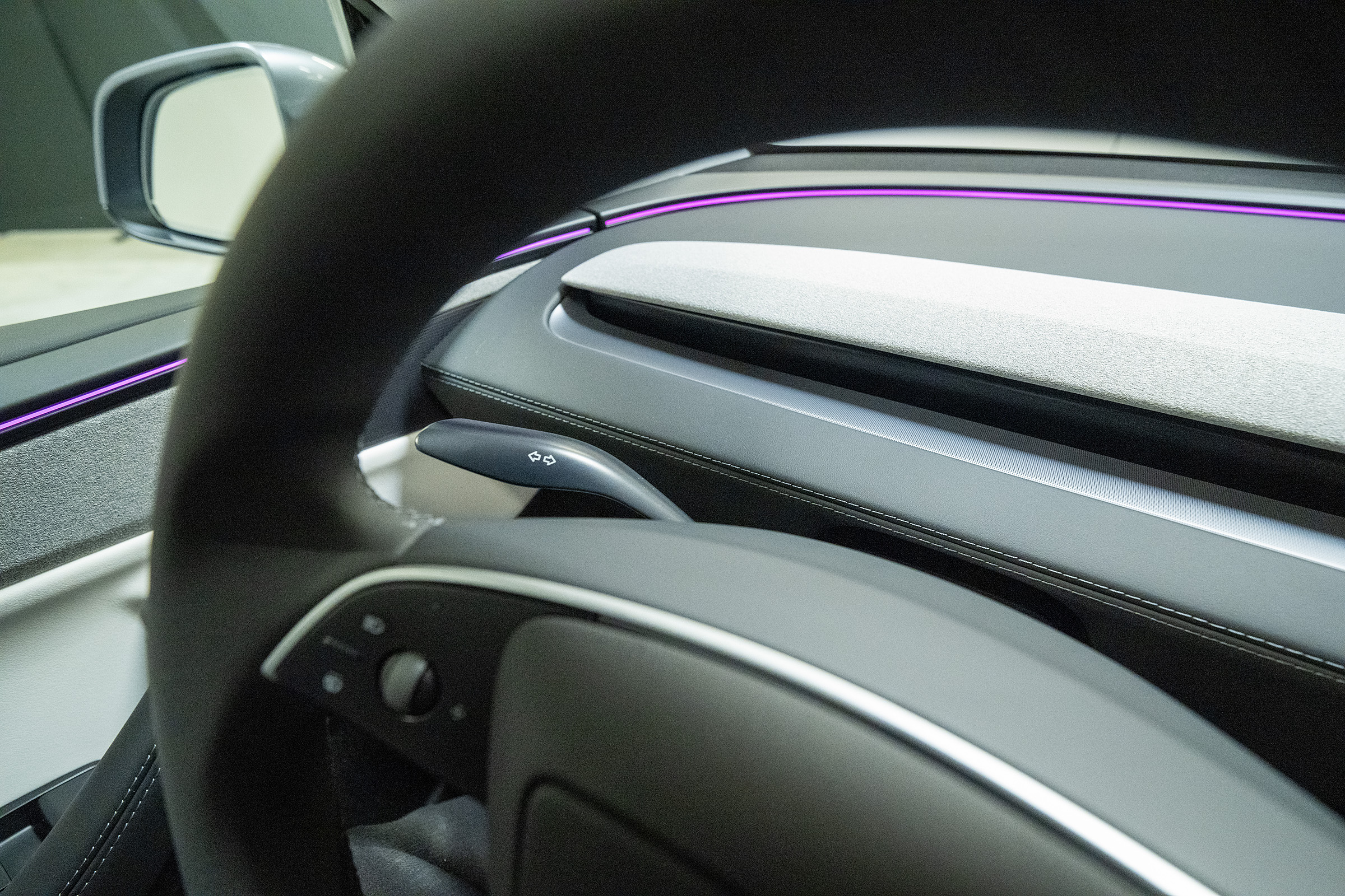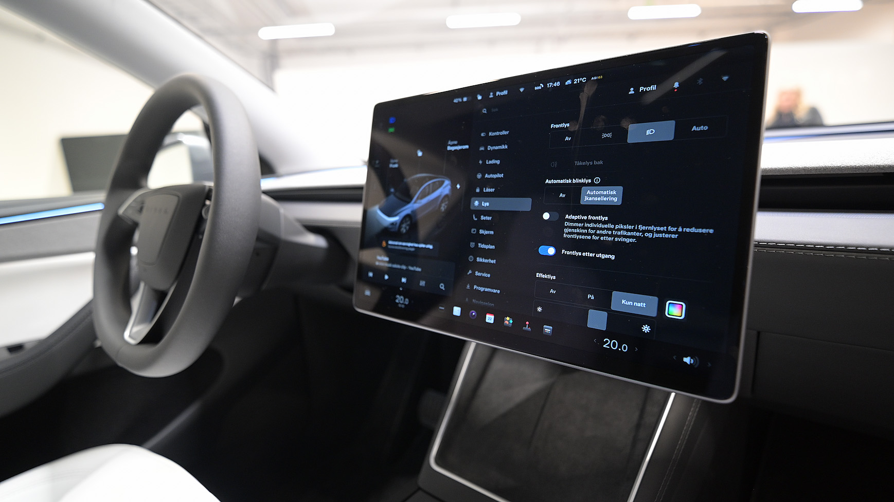 Det er fint å se at Tesla har hørt på sine brukere, som har ønsket å beholde blinklyset som en hendel – og ikke som knapp på rattet. Det er også bra å se at vindusviskerne har egen knapp. Jeg har selv en Plaid Model X, med blinklys som knapper på rattet, og det går greit, men der har jeg også et Yoke-ratt med en fasong som gjør det lettere å vite hvilken knapp som er hvilken, selv om rattet er opp-ned. Der er det også et instrumentpanel, som uten et stort ratt og mange hendler i veien, er enklere å se for en sjåfør på 167 cm – som av og til må titte gjennom rattet på vår gamle Model S for å se hva som skjer på skjermen.