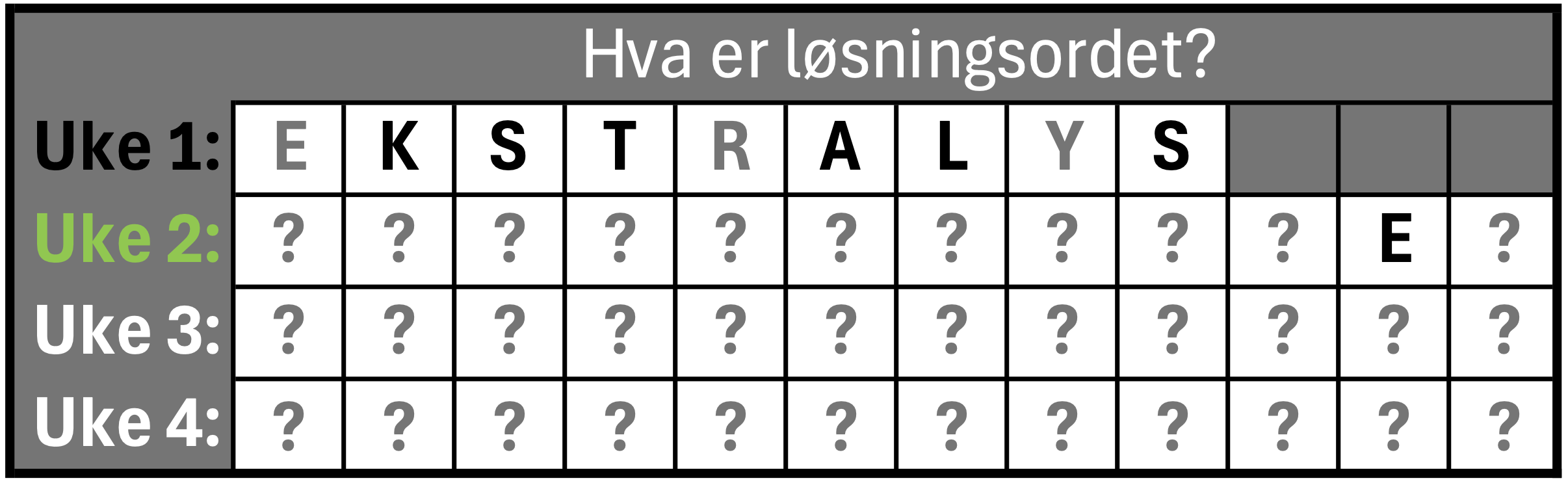 Ordet har (i en eller annen form) relevans til ukens samarbeidspartner. Vi avslører minst én bokstav hver dag gjennom uka. Bokstavene er plassert på riktig sted i ordet. Førstemann med riktig løsning, vinner.