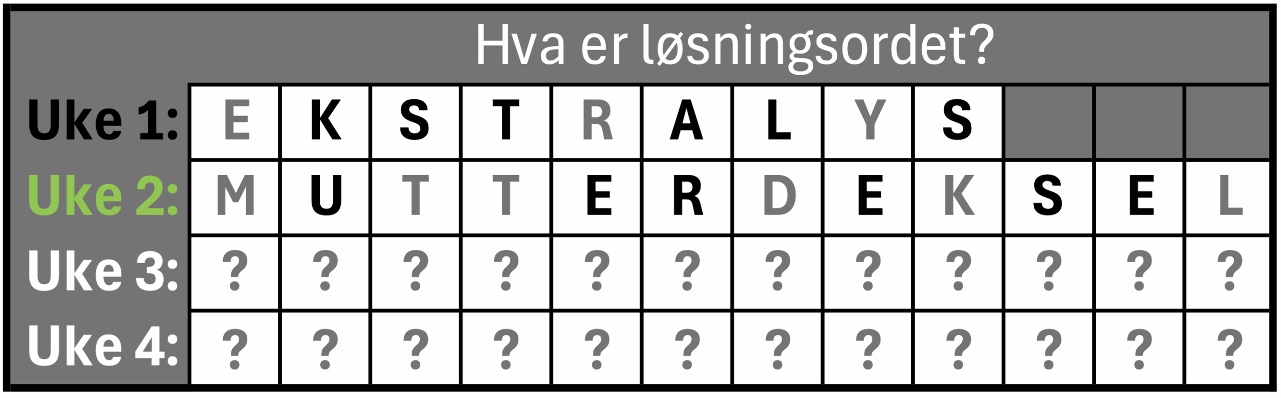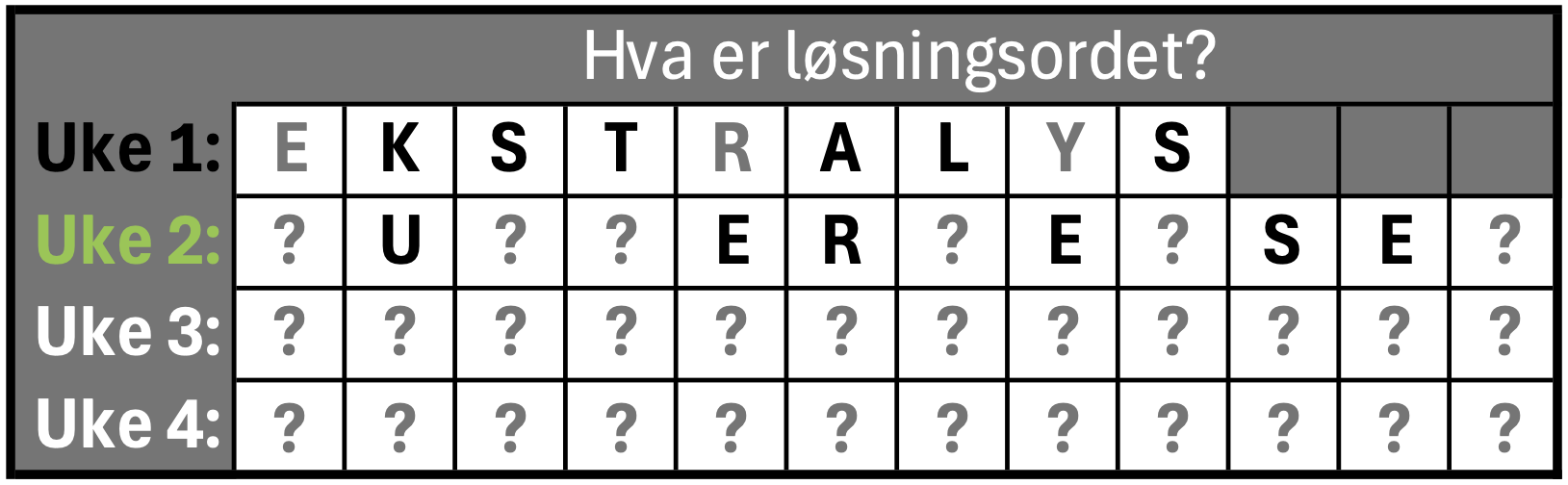 Ordet har (i en eller annen form) relevans til ukens samarbeidspartner. Vi avslører minst én bokstav hver dag gjennom uka. Bokstavene er plassert på riktig sted i ordet. Førstemann med riktig løsning, vinner.