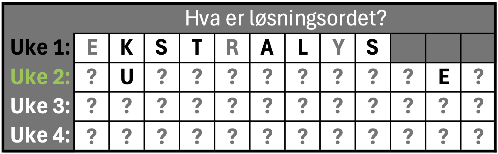 Ordet har (i en eller annen form) relevans til ukens samarbeidspartner. Vi avslører minst én bokstav hver dag gjennom uka. Bokstavene er plassert på riktig sted i ordet. Førstemann med riktig løsning, vinner.